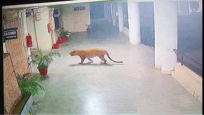 अमरावती : येथील वडाळी परिसरात राज्‍य राखीव पोलीस दलाचे मुख्‍य कार्यालय आहे. या कार्यालयाच्‍या इमारतीत शनिवारी रात्री एक बिबट्या शिरला. पहाटेपर्यंत त्याचा वावर याच इमारतीत होता. सीसीटीव्ही कॅमेरामध्ये या बिबट्याच्या हालचाली चित्रित झाल्या आहेत.